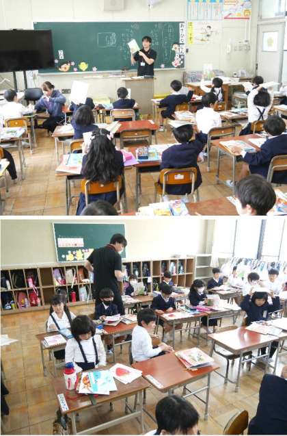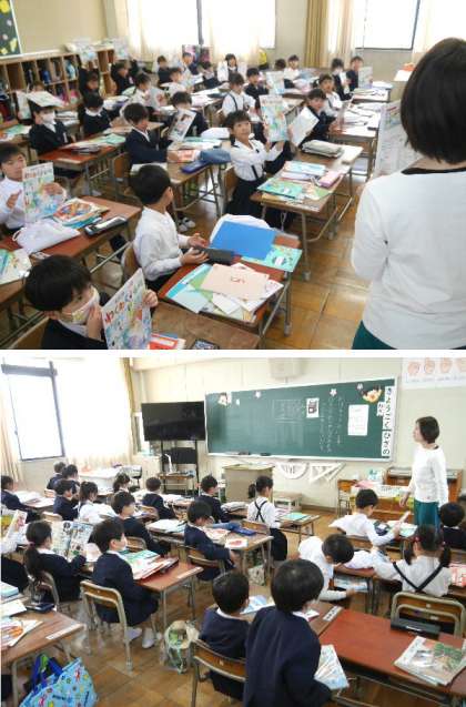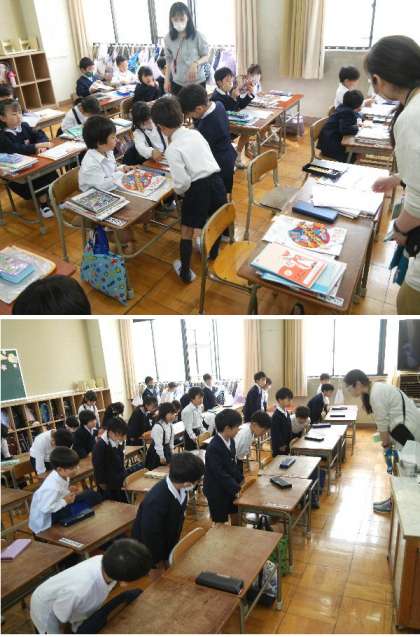 入学して授業初日の1年生です。教科書の確認や、授業の最初と終わりのあいさつの練習などしていました。