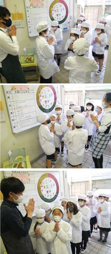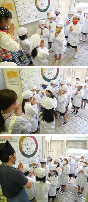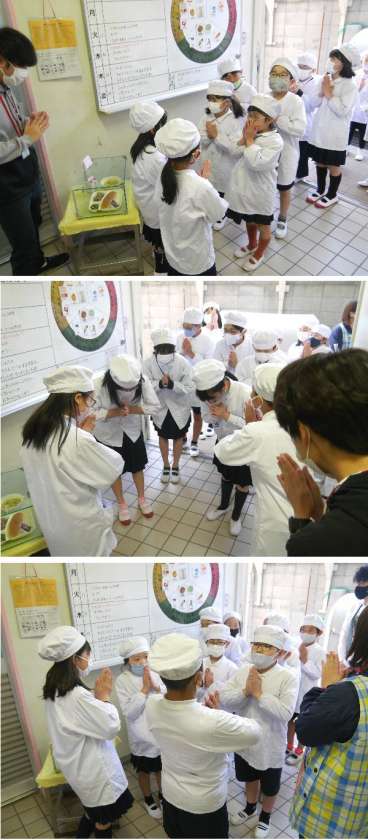 2年生〜6年生も今日から給食が始まります。給食室まで給食当番が取りに行きます。しっかりあいさつをしています。「いただきます」と声がひびきます。