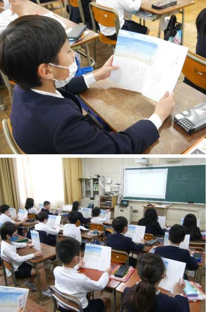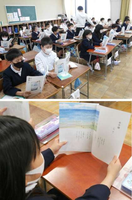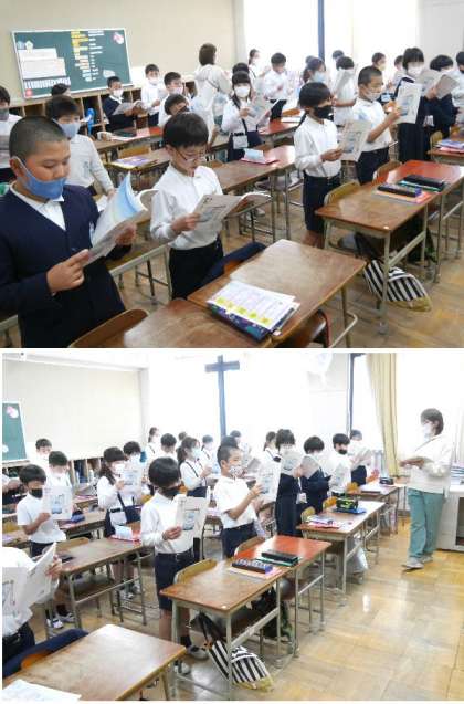 4年生が国語の教科書をあけて、音読をしています。それぞれの学年で教科授業が始まります。