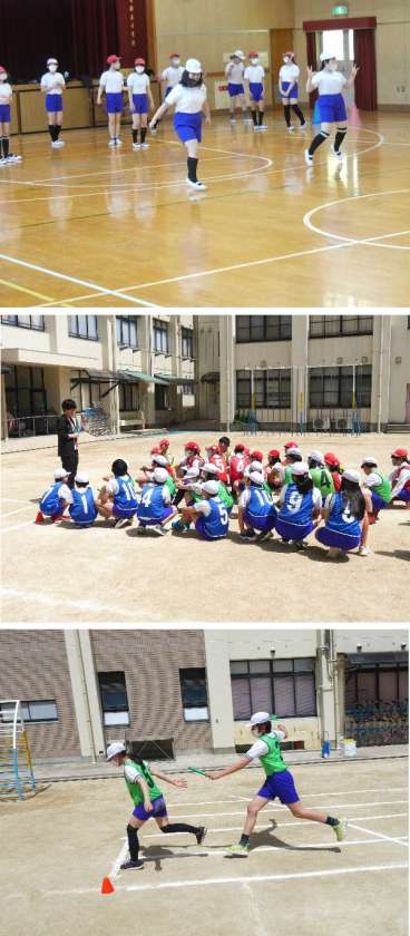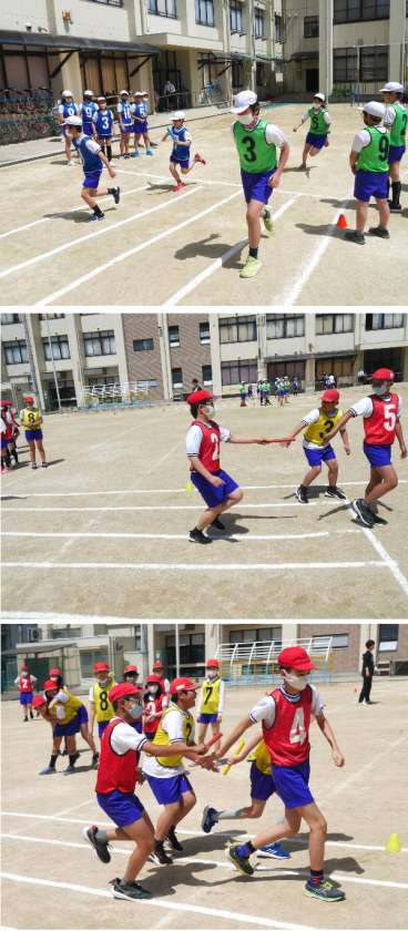 6年生の体育です。講堂と運動場でおこなっていました。講堂では、ぐーちょきパーを身体全体で走りながら基礎運動をしていました。運動場ではリレーのバトンの練習をしていました。