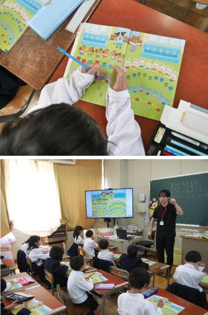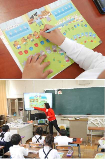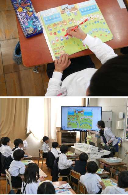 1年生の算数では、かずをかぞえる練習をしています。教科書の導入部分になります。たねまきで、必要なバケツやスコップがたりているか、線でつないでみています。