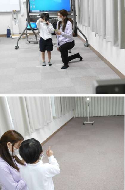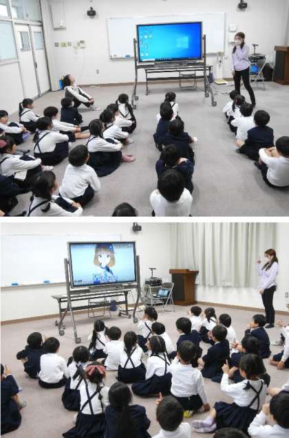 1年生が、視力検査をしています。保健室の先生が、まばたきストレッチの動画を、いっしょにやってくれました。指でさして検査していました。