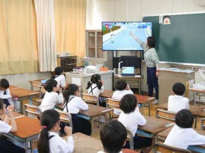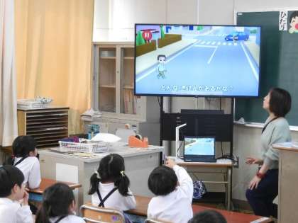 春のこの時期に、各学年の各教室で、交通安全指導ビデオをみて学習しています。1年生の教室でもビデオを見ながら担任の先生が説明しています。