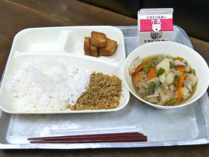 今日の献立は、鶏肉とじゃがいもの煮もの、あつあげのしょうゆだれかけ、紅ざけそぼろ、ごはん、牛乳でした。