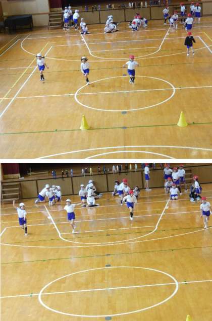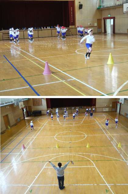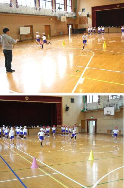 3年生が体育館で、ダッシュをしたり、スキップしたり、基礎的な体力づくりに取り組んでいました。