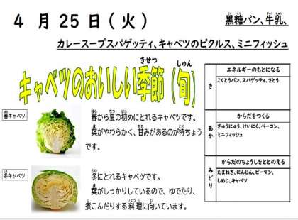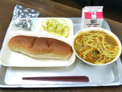 今日の献立は、カレースープスパゲッティ、キャベツのピクルス、ミニフィッシュ、黒糖パン、牛乳でした。