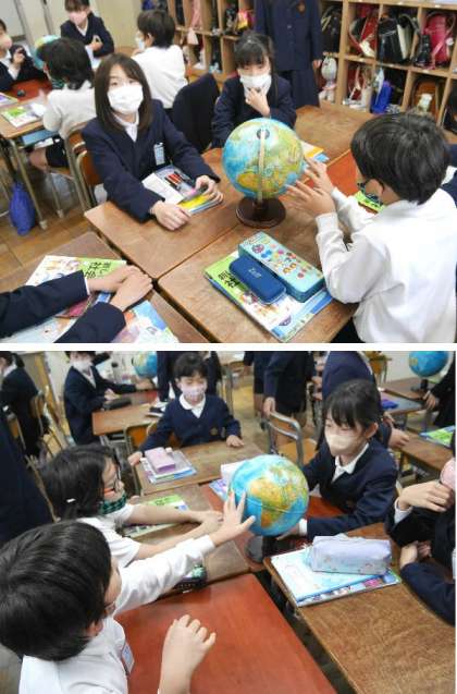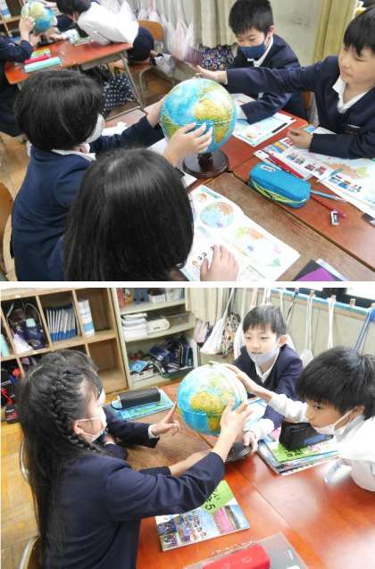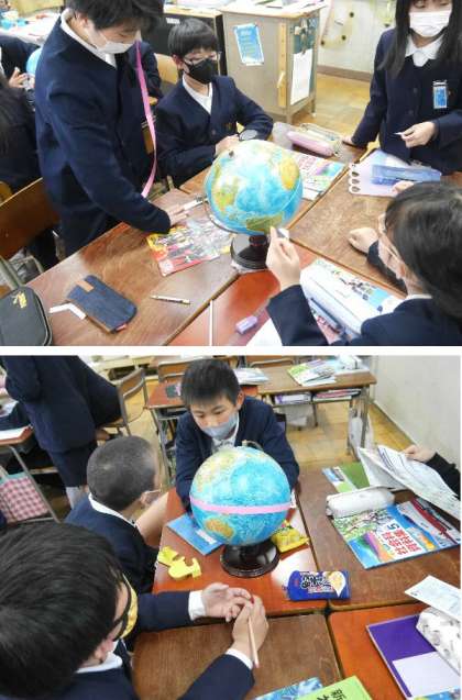 5年生の社会では地理について学習しています。地球儀で地球の円周を測っています。