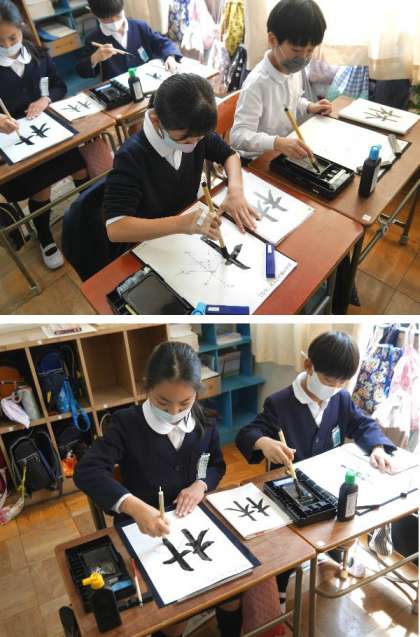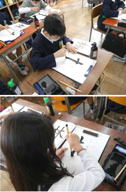4年生が習字で、「林」を練習していました。めあては、左右のバランスを考えて書こうです。見本にあわせて書いてから、仕上げを書きます。