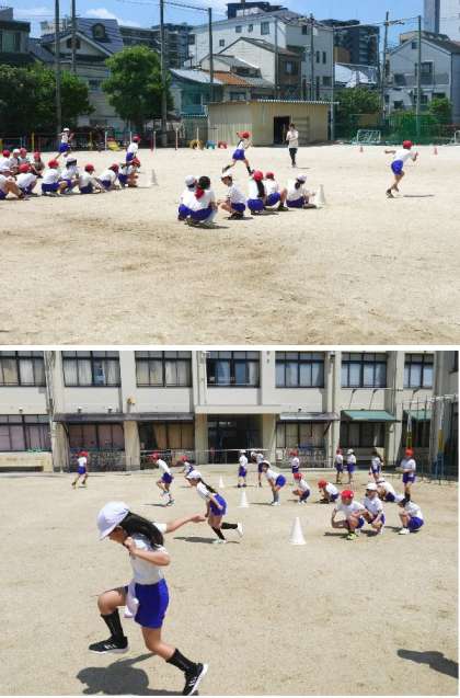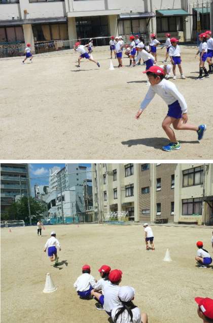 今日は、とても気持ちのいい天気です。運動場で3年生が体育の授業をしています。