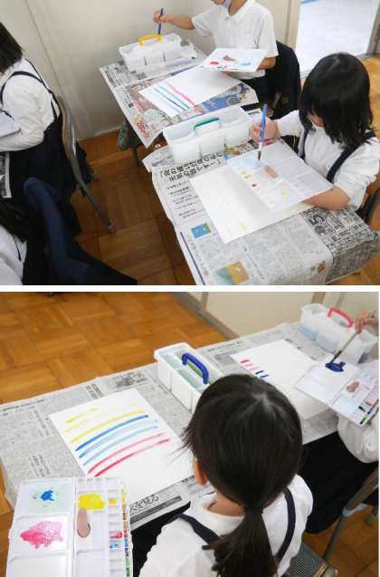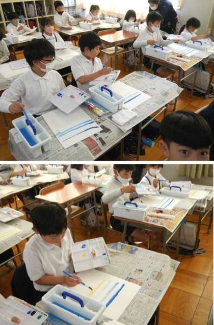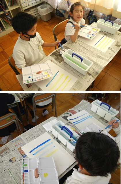 3年生の図工では、本格的に水彩絵の具を使って作品を作っていきます。絵の具の水の量を調整して描く練習をして試しています。