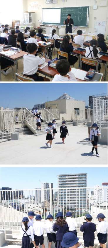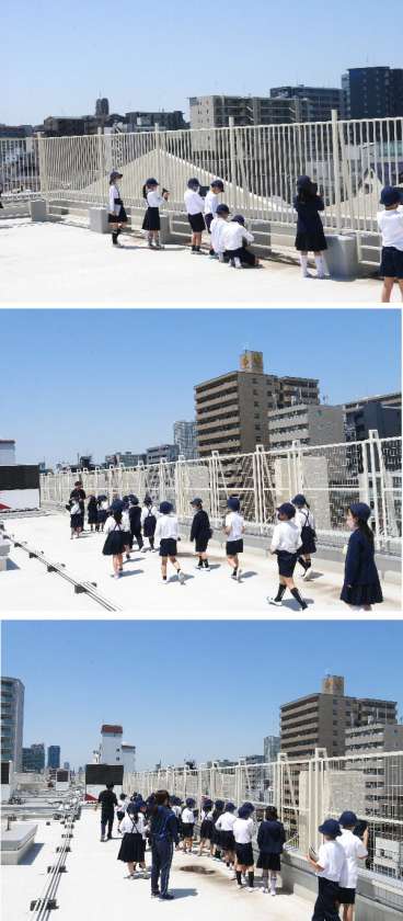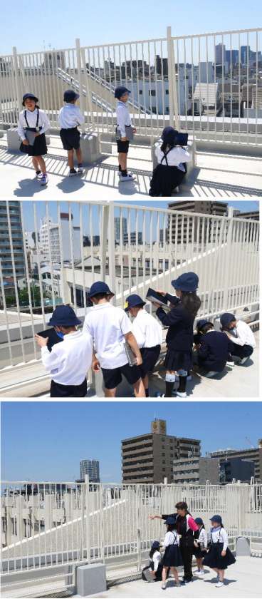 3年生の社会では、校区について調べています。屋上から東西南北に何が見えるか調べました。パソコンで写真を撮影しました。