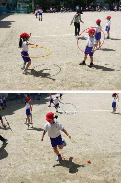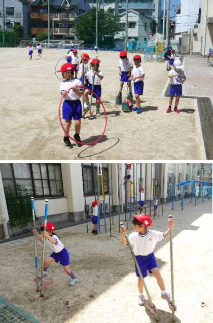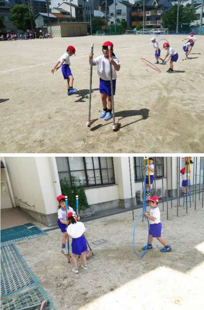 1年生の体育で、運動場にあるいろいろな遊具を使った遊びにチャレンジしていました。