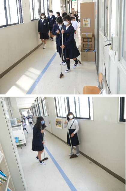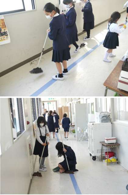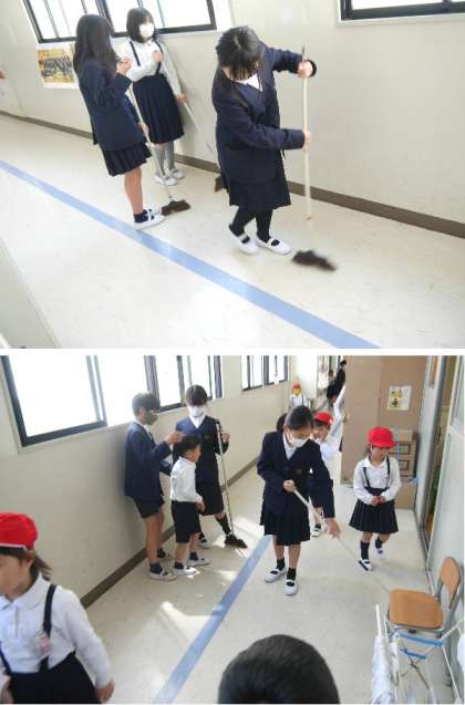 給食のあとは、全校児童で清掃活動です。1年生はまだその余裕がなかなかありませんが、6年生が廊下の清掃に来てくれています。
