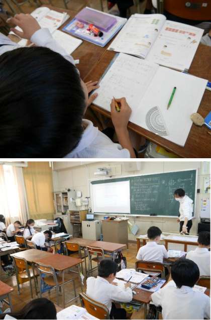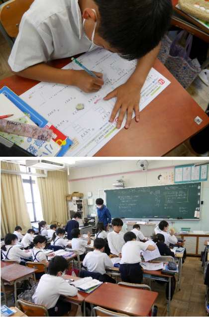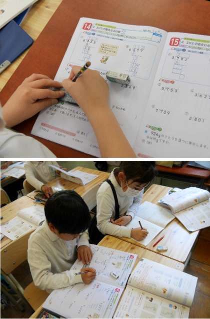 3年生の算数では、3ケタのわり算の計算を練習しています。習熟度別少人数授業で各教室に分かれて算数をしています。2ケタの計算から3ケタへの計算へ、少しずつ難しくなっていきます。