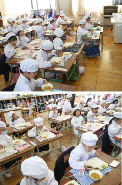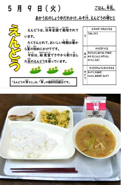 今日の献立は、あかうおのしょうゆだれかけ、みそ汁、えんどうの卵とじ、ごはん、牛乳でした。季節を感じられる食材があり、おいしいですね。