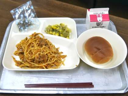 今日の献立は、ミートソーススパゲッティ、レタスとコーンのサラダ、ミニフィッシュ、黒糖パン、牛乳でした。