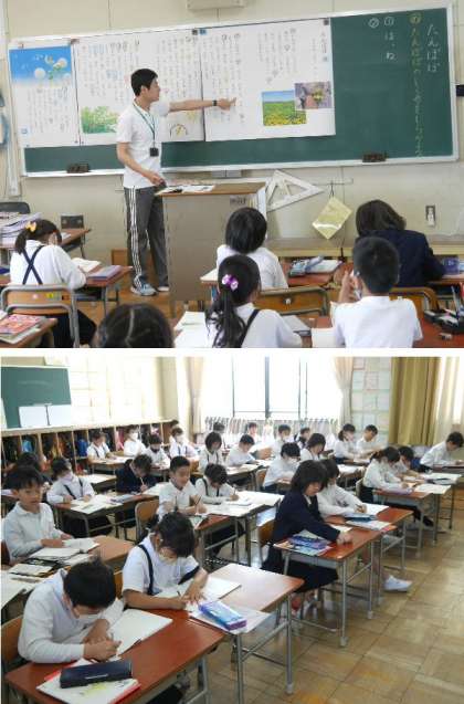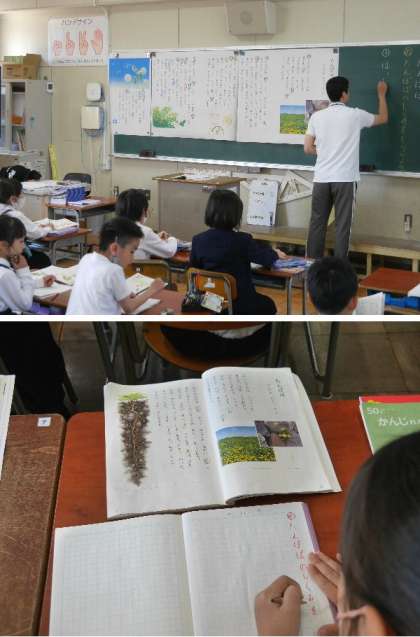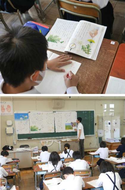 2年生の国語では、教科書「たんぽぽ」を学習しています。教科書を大きくカラーコピーした用紙を見ながら、文章の流れを見て、たんぽぽのしくみを調べています。