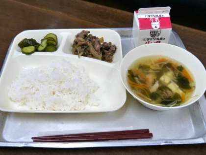 今日の献立は、プルコギ、とうふとわかめのスープ、きゅうりの甘酢づけ、ごはん、牛乳でした。