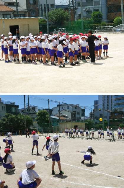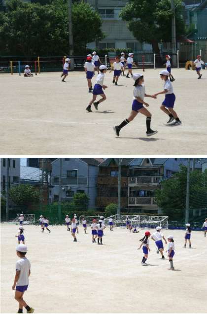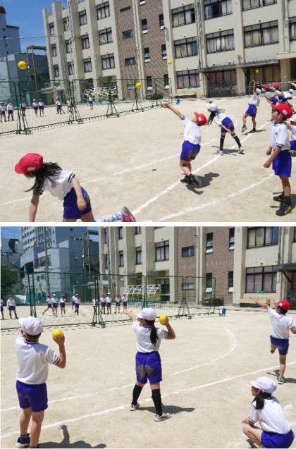 3年生の体育では、運動場でおにごっこで身体をほぐしたあと、体力テストのボール投げの練習をしました。来週から、第2グランド等で体力テストを行います。