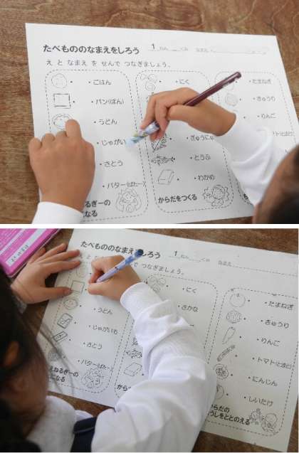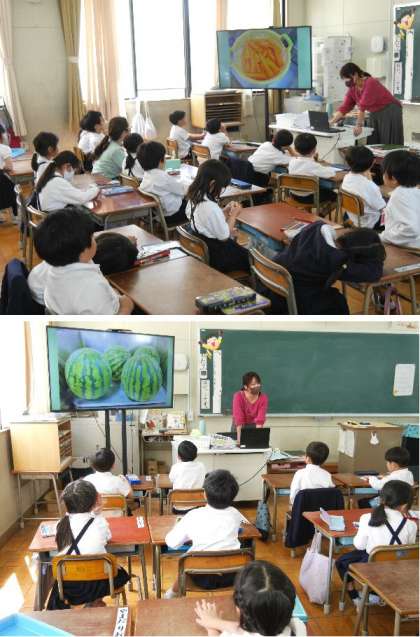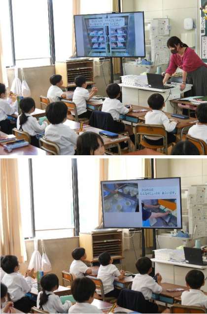 本校の栄養教諭先生が、1年生に栄養授業を行いました。給食室でどうやって給食をつくっているかなどを教えてもらいました。また、たべものの名前について学習しました。