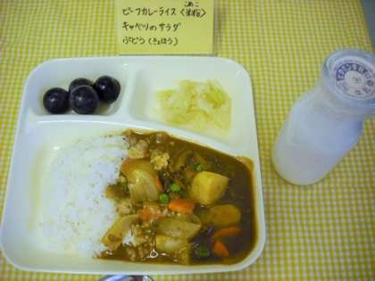 今日の献立は、ビーフカレーライス(米粉)、キャベツのサラダ、ぶどう(巨峰)、牛乳」です。