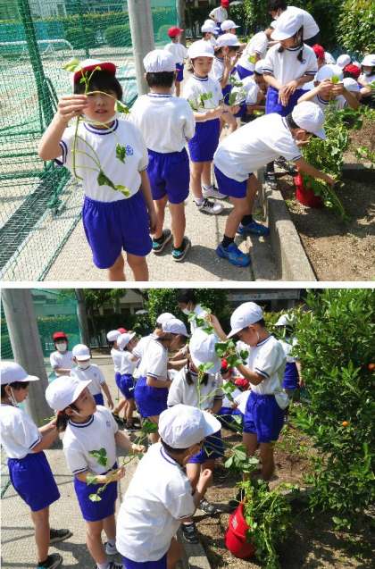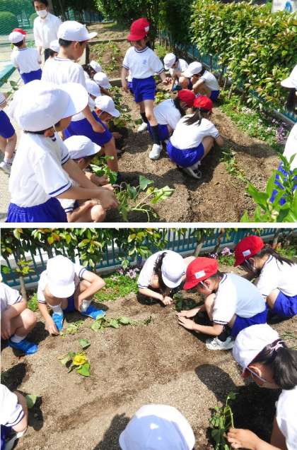 2年生がサツマイモの苗を植えています。収穫は秋になります。大きくておいしいサツマイモができるといいですね。