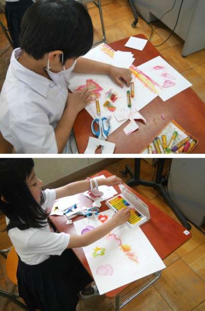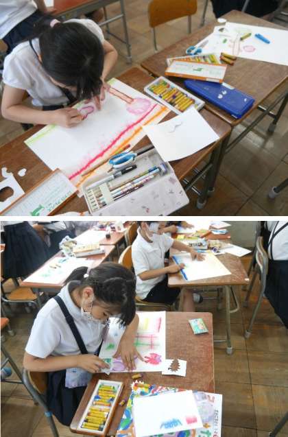 2年生は、いろいろな型紙を作って、クレパスで色をぬりこんで、ぼかして絵を描いていました。いろいろと工夫しながらしあげています。
