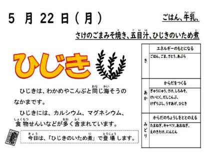 今日の献立は、さけのごまみそ焼き、五目汁、ひじきのいため煮、ごはん、牛乳でした。