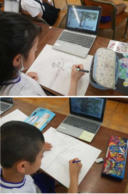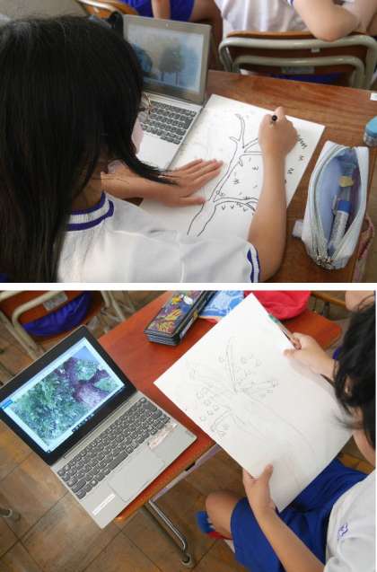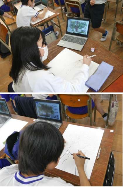 4年生が、タブレットで撮ってきた木の絵をペンてで描いていました。