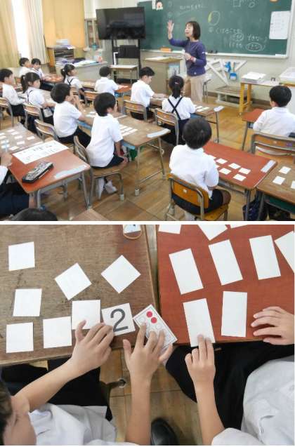 1年生では、1から10までのカードを使って学習しています。数字のカードと点のカードで同じものをだしあっています。
