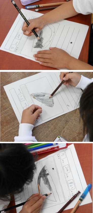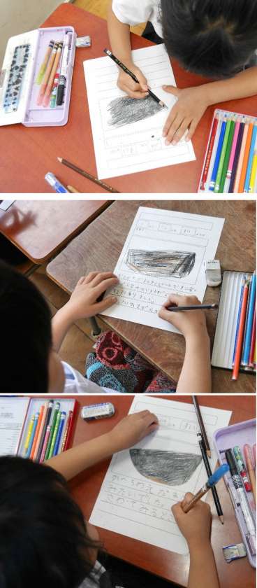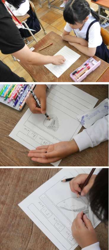 1年生の生活科では、これからアサガオをそだてていきます。今日は、アサガオの種を1個ずつもらって観察して絵を描いたり、気づいたことをかいていました。