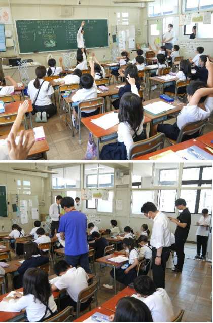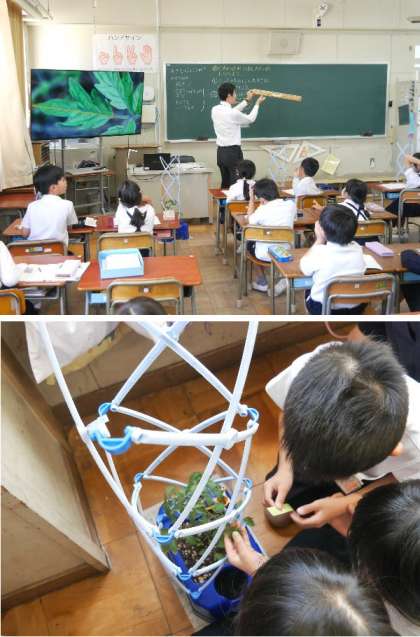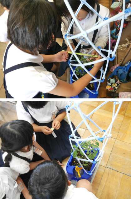 2年生の算数で研究授業が行われました。2年生がそだてているミニトマトの葉っぱをくらべて一番大きなものを調べます。メモリさしを使って調べて、班ごとに発表して比べてみました。1センチメートルという新しい単位も学習しました。