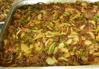 給食のプルコギは、牛肉、たまねぎ、ピーマンにしょうが、にんにく、コチジャン、ごま油などで下味をつけて焼き物機で焼きます。
