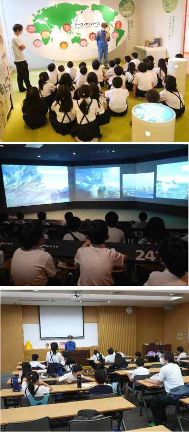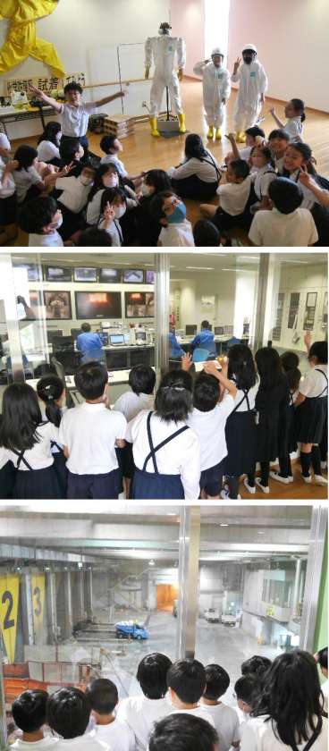 4年生が社会見学でごみ処理工場にきました。工場の説明をビデオなどでみてから、工場内を見学しています。中央制御室やパッカー車がごみを捨てるところを見て、最後にアニメをみてクイズに答えました。質問コーナーでは沢山の質問をしていました。