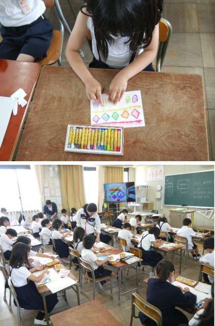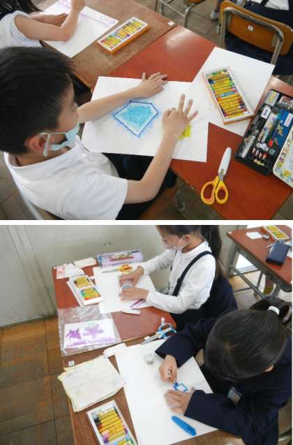 2年生が型紙などを使って、クレパスを指でのばして、ぼかして絵を描いています。いろいろな模様がカラフルにできています。