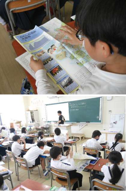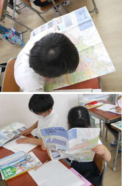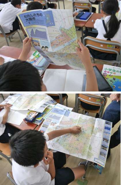 3年生が大阪市の地図をひろげています。大阪市には、どんな場所があるのだろうか。みんなの知っている有名な場所を探してみました。
