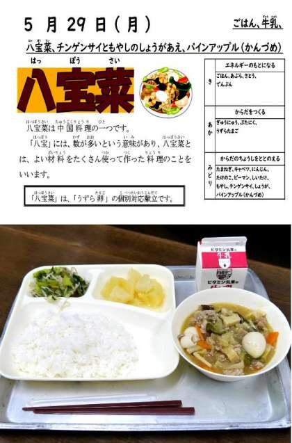 今日の献立は、八宝菜、チンゲンサイともやしのしょうがあえ、パインアップル(缶)、ごはん、牛乳でした。
