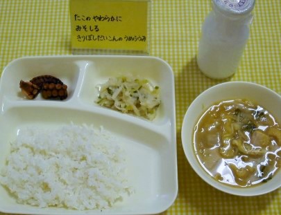 今日の献立は、「たこのやわらか煮、みそ汁、切り干しだいこんの梅風味、ごはん、牛乳」です。