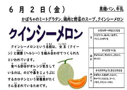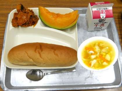 今日の献立は、かぼちゃのミートグラタン、鶏肉と野菜のスープ、クインシーメロン、黒糖パン、牛乳でした。