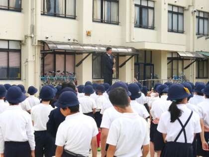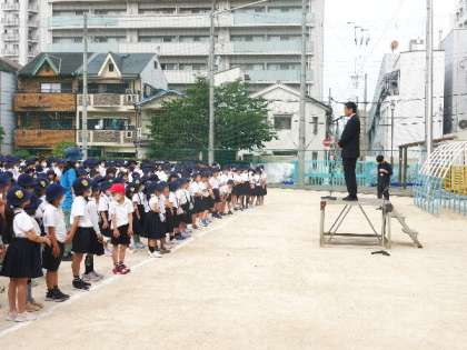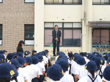 今日の全校朝会は運動場で行いました。校長先生から、今日6月5日は「世界環境デー」であるお話と、6月10日は「時の記念日」のお話をしました。