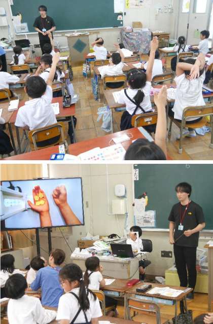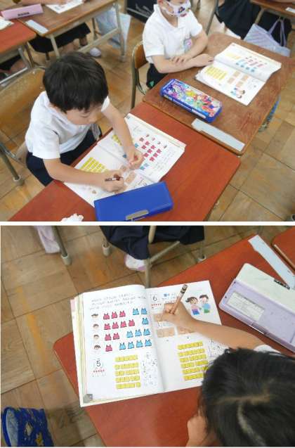 1年生の算数では、「6コもっています。いくつといくつで6コになるかな」をしていました。実際に子ども達にもってもらって考えました。