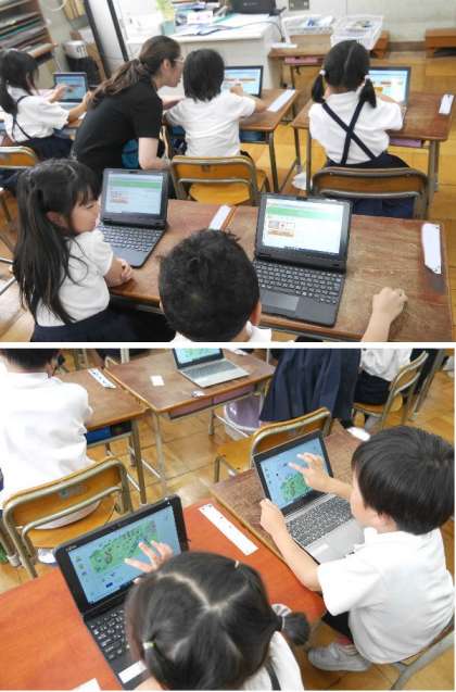 来週末の土曜参観にむけて、1年生では1人1台学習端末のパソコンの使い方を練習しています。「心の天気」の入力、「デジタルドリル」、「オンラインチームズ」を使った練習をしています。