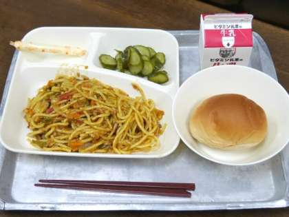 今日の献立は、カレースパケッッティ、きゅうりのピクルス、棒チーズ、黒糖パン、牛乳でした。
