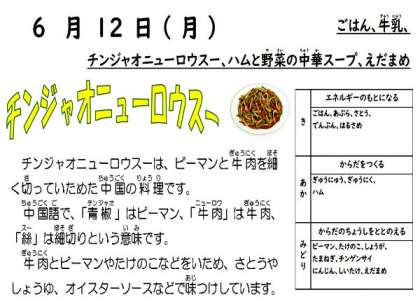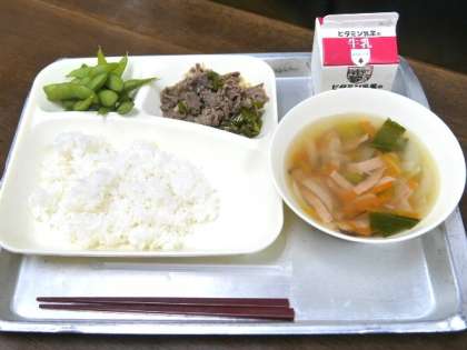 今日の献立は、チンジャオニューロウスー、ハムと野菜の中華スープ、えだまめ、ごはん、牛乳でした。