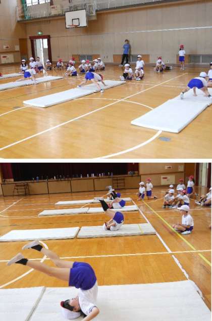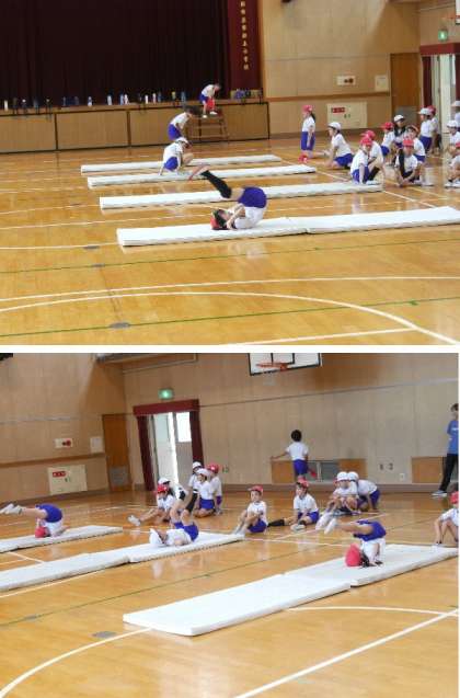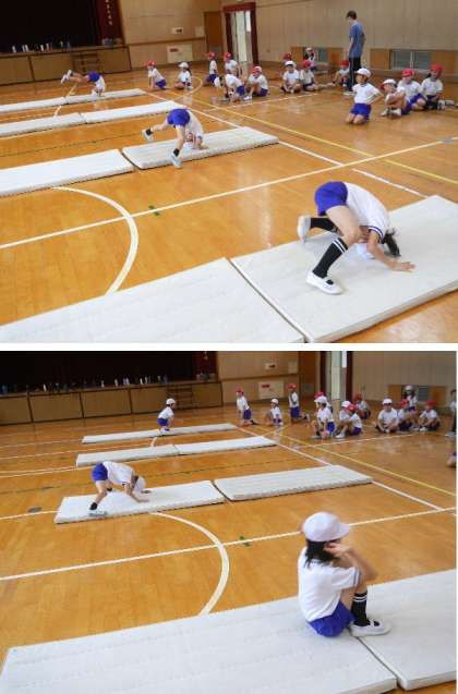 3年生の体育では、これまで練習してきたマット運動のテストをしていました。