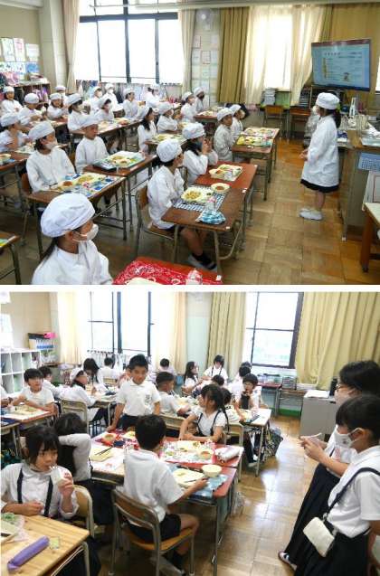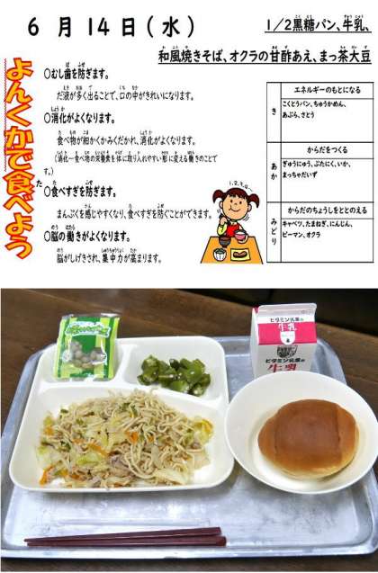 今日の献立は、和風焼きそば、オクラの甘酢あえ、まっ茶大豆、黒糖パン、牛乳でした。