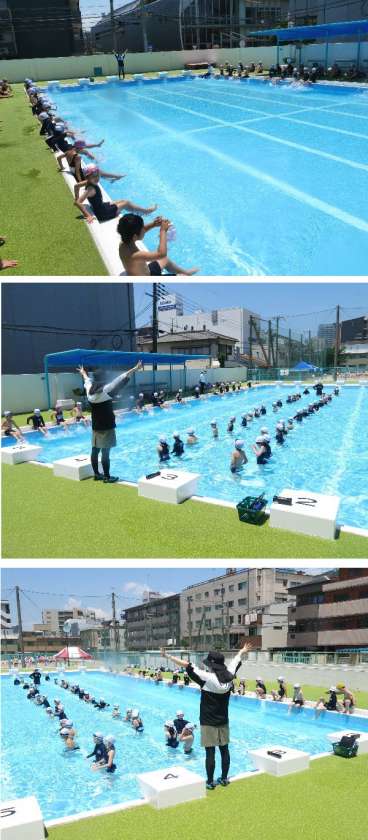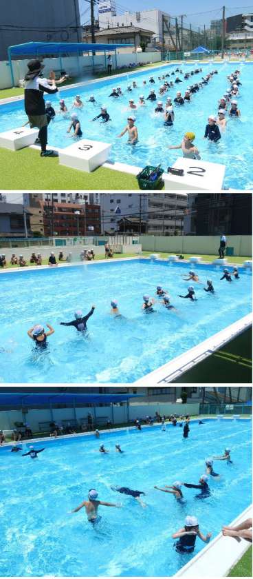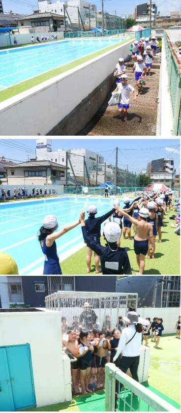 2年生もはじめてプールに入りました。1年生のときにも入っているので、スムーズに進みます。シャワーや水に入って、ついつい声がでてしまっていました。なかなか静かにならないので、先生の声が聞こえないときもありました。でも楽しそうでした。