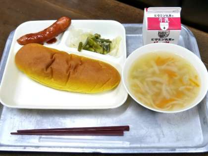 今日の献立は、ウインナーのケチャップソース、スープ、キャベツとさんどまめのサラダ、パンプキンパン、牛乳でした。