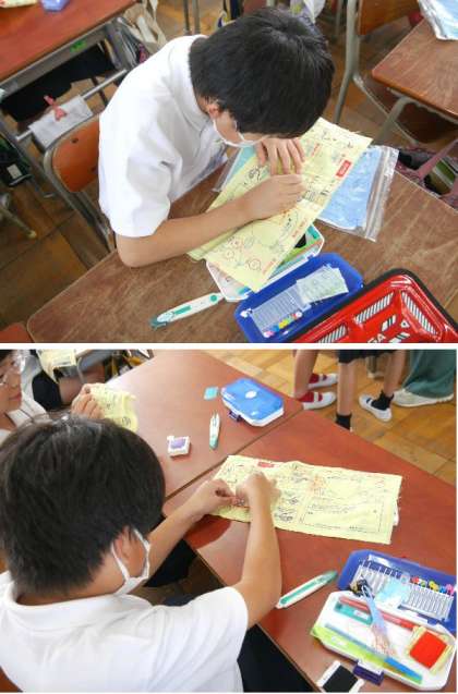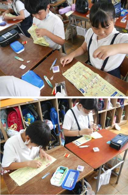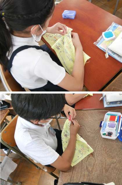 5年生の家庭科では裁縫の練習です。今日は、本返し縫い、半返し縫いを練習していました。