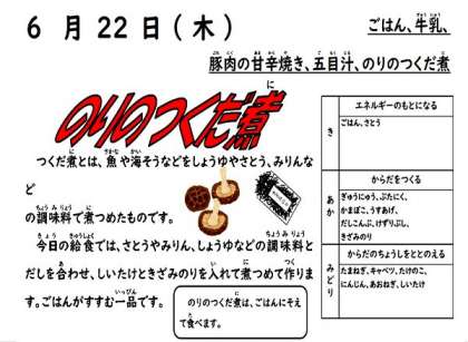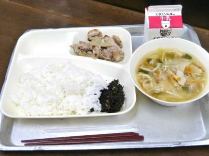 今日の献立は、豚肉の甘辛焼き、五目汁、のりのつくだ煮、ごはん、牛乳でした。